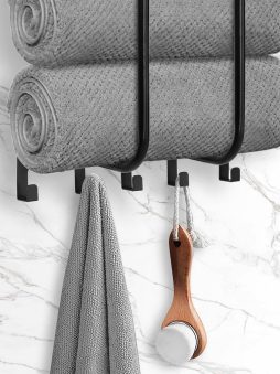 Introducing the ultimate space-saving solution for your bathroom – the Towel Rack Wall Mounted with Metal Shelf and 5 Hooks. Keep your towels neatly organized and easily accessible with this stylish and functional towel holder. Constructed with high-quality metal in a sleek black finish, this towel rack not only provides ample storage for your bath…