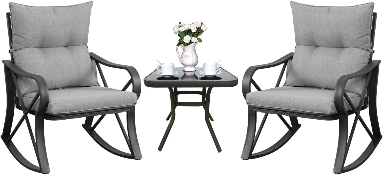 COSIEST 3 Piece Bistro Set Patio Rocking Chairs Outdoor Furniture w Warm Gray Cushions, Glass-Top Table for Garden, Pool, Backyard