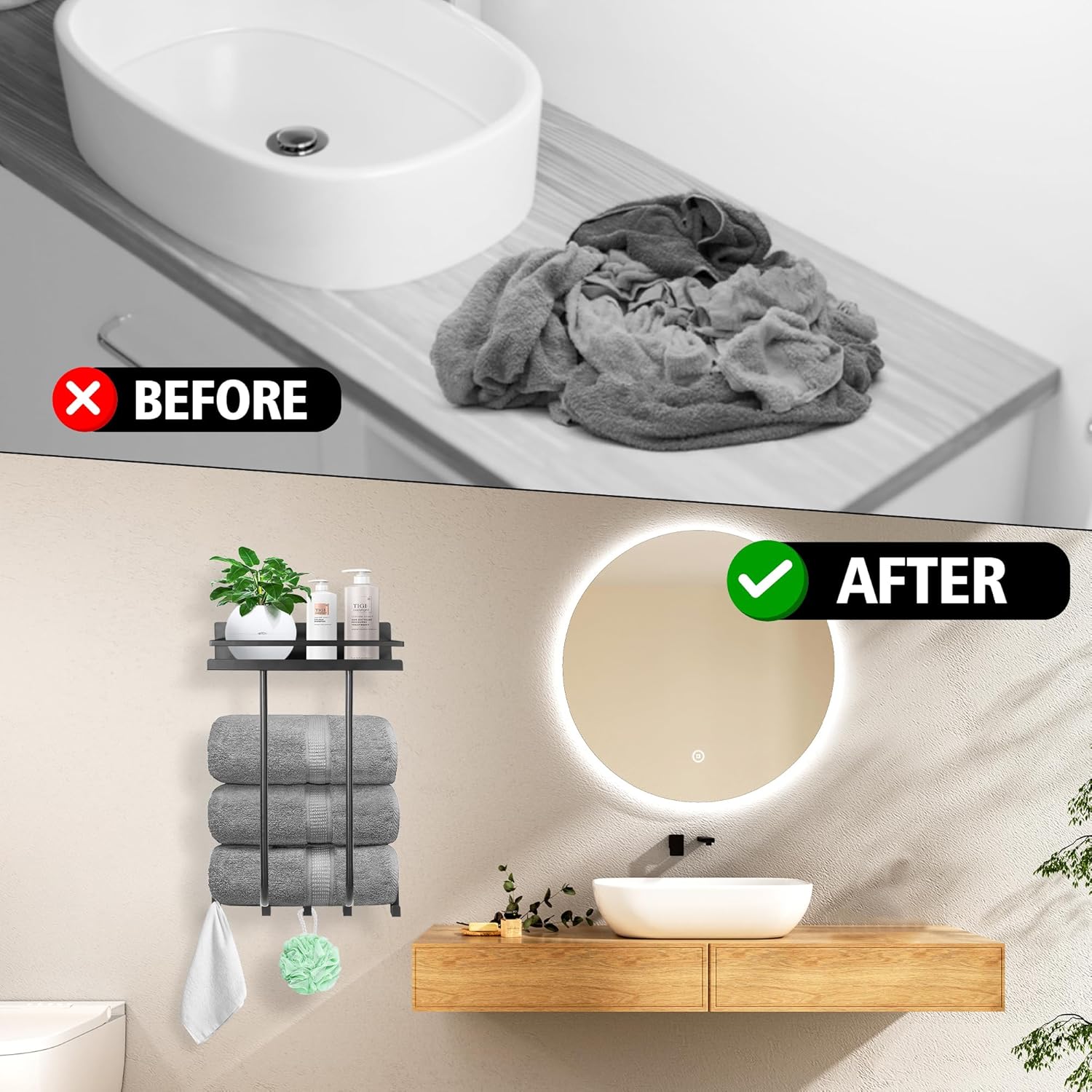 Upgrade your bathroom with the Towel Rack Wall Mounted with Metal Shelf and 5 Hooks today and enjoy a more organized and stylish space.